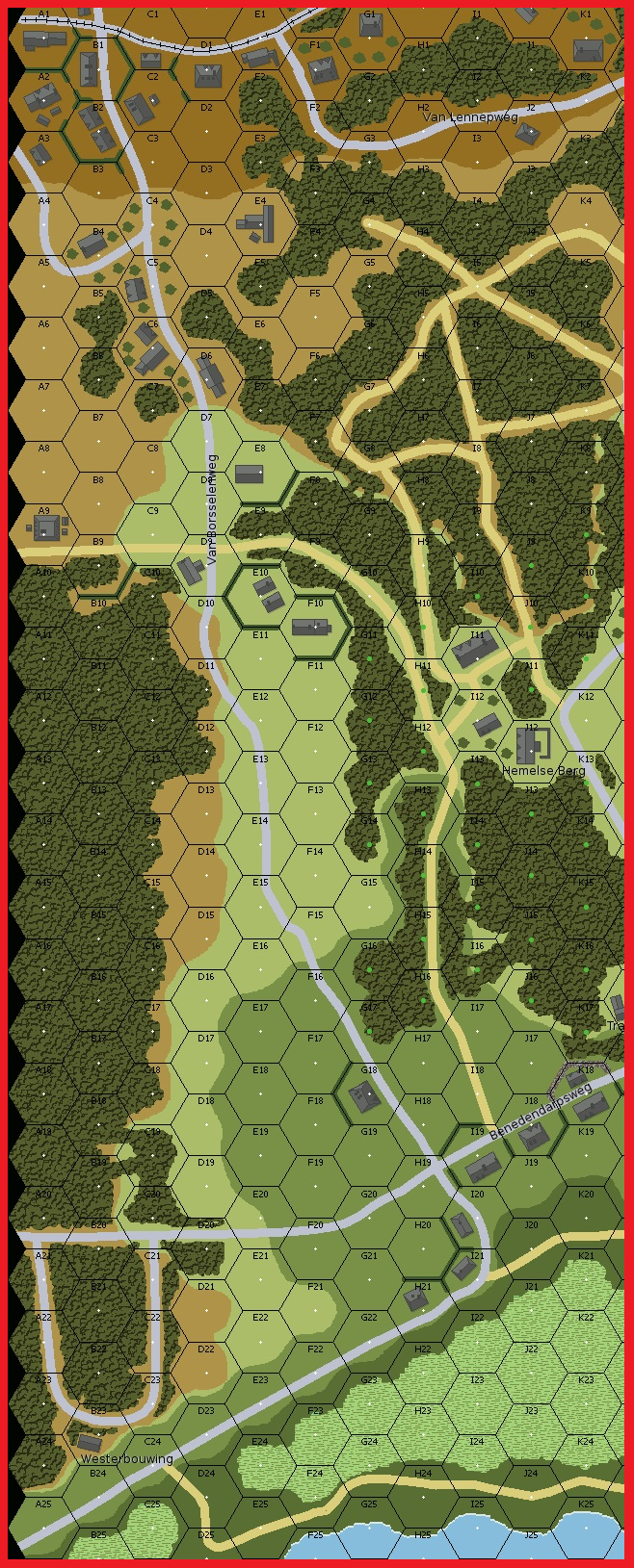 The 1st Border Battalion held the left flank of the 1st Airborne Division perimeter, following the original plans laid down in England. Their sector was heavily wooded, and this left each of the rifle companies dangerously segregated, especially as radio communication was spotty at best. Nearest the Rhine were the men of B Company, holding the Westerbouwing restaurant by the 90-foot bluff overlooking the Rhine and the ferry—the highest point of the perimeter, with a dramatic view all the way back to Nijmegen. At 0900 on Thursday morning, and unblooded battalion of troops from the Hermann Goering NCO school appeared in front of B Company with no advance bombardment. The Brens, Lee-Enfields and Stens of 11 Platoon, the most forward, scored many kills before falling back in disarray. A troop of tanks turned into the restaurant driveway and, in an instant, the Germans were amidst the glider-men.Attacker: German (Hermann Goering Training School and Panzer Kompanie 224)