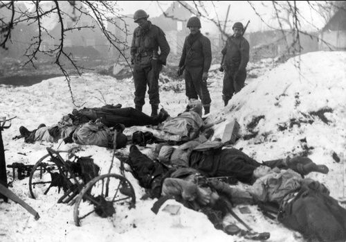 Soldiers of the 3rd Infantry Division looking upon frozen German corpses sometime during the Battle of Jebsheim